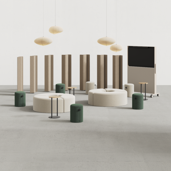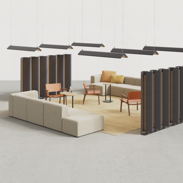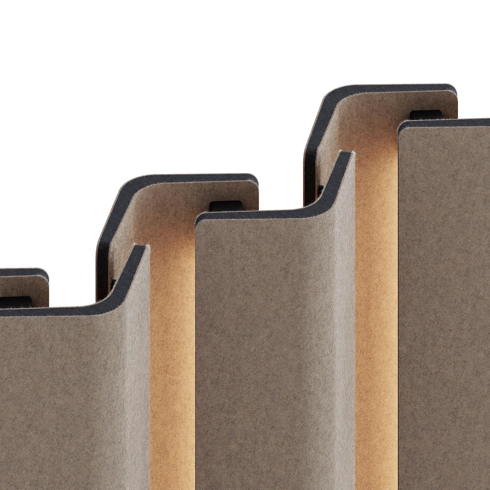 Vika kısmen geri dönüştürülmüş PET şişelerden yapılmış, yumuşak, ses emici bir çekirdekten oluşuyor ve Texfel kumaşla kaplanıyor. Hem tavana asılan akustik armatür hem de armatürlü zemin perdesi olarak mevcuttur.