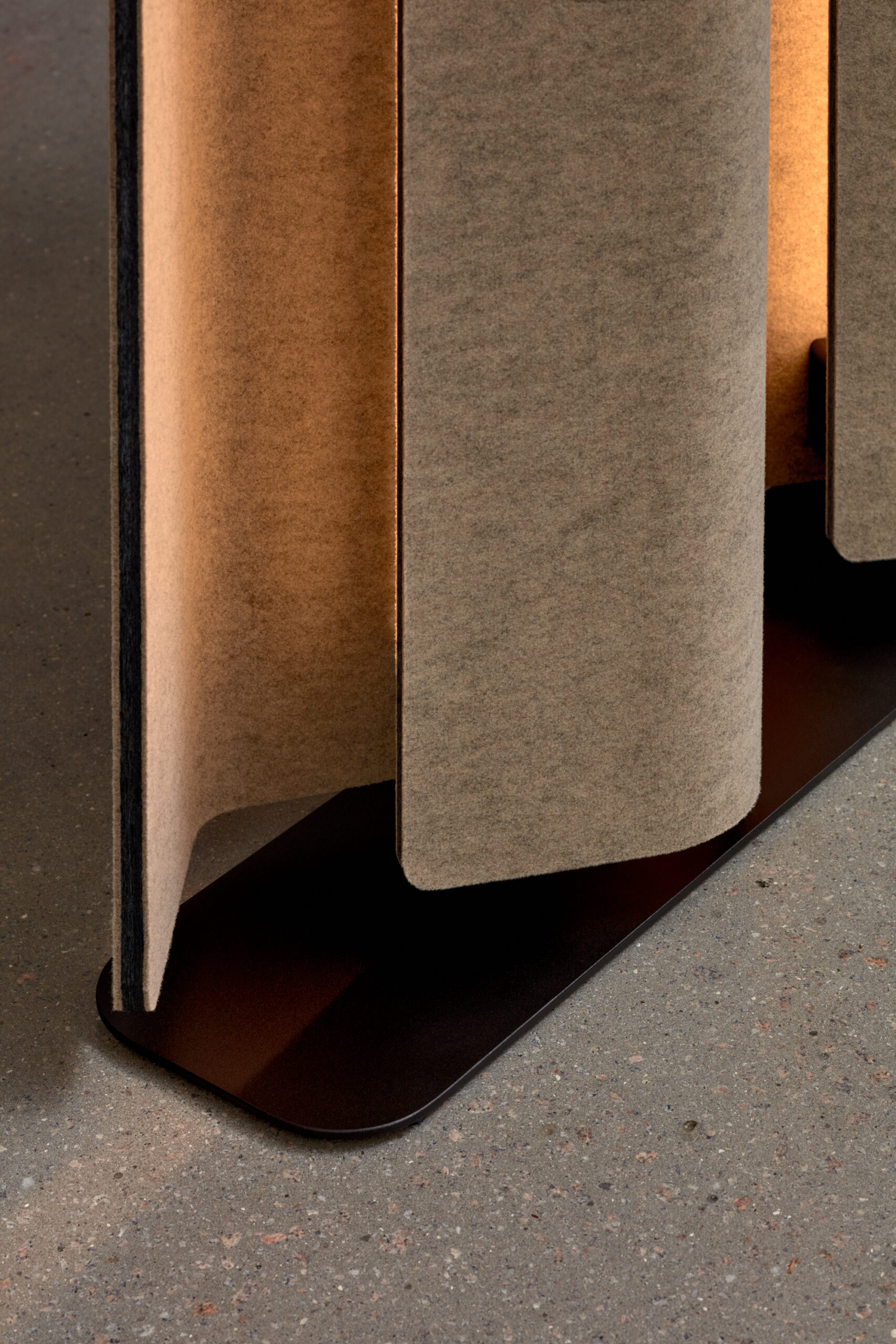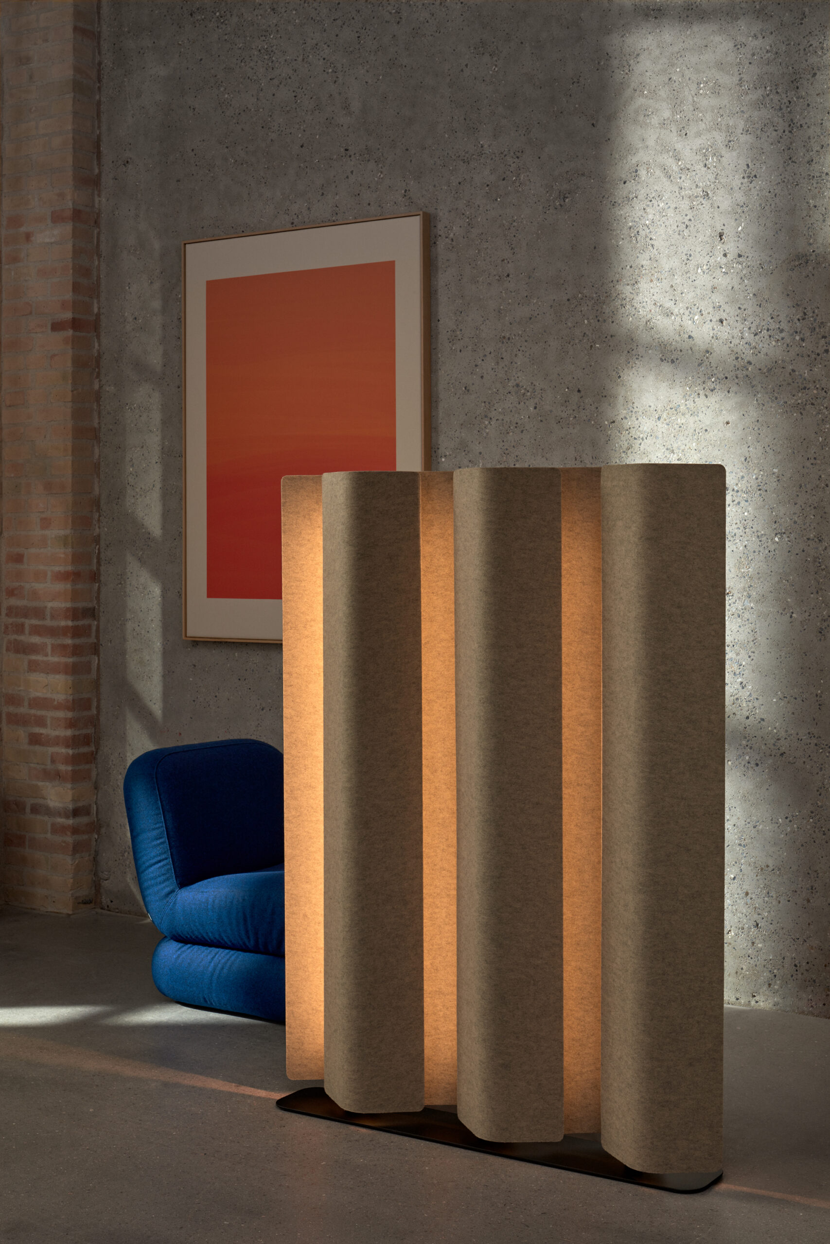 Vika'nın temel formu basit olduğu kadar ustaca: kanat şeklinde katlanmış, ses emici keçeden yapılmış dikdörtgen bir zemin perdesi.