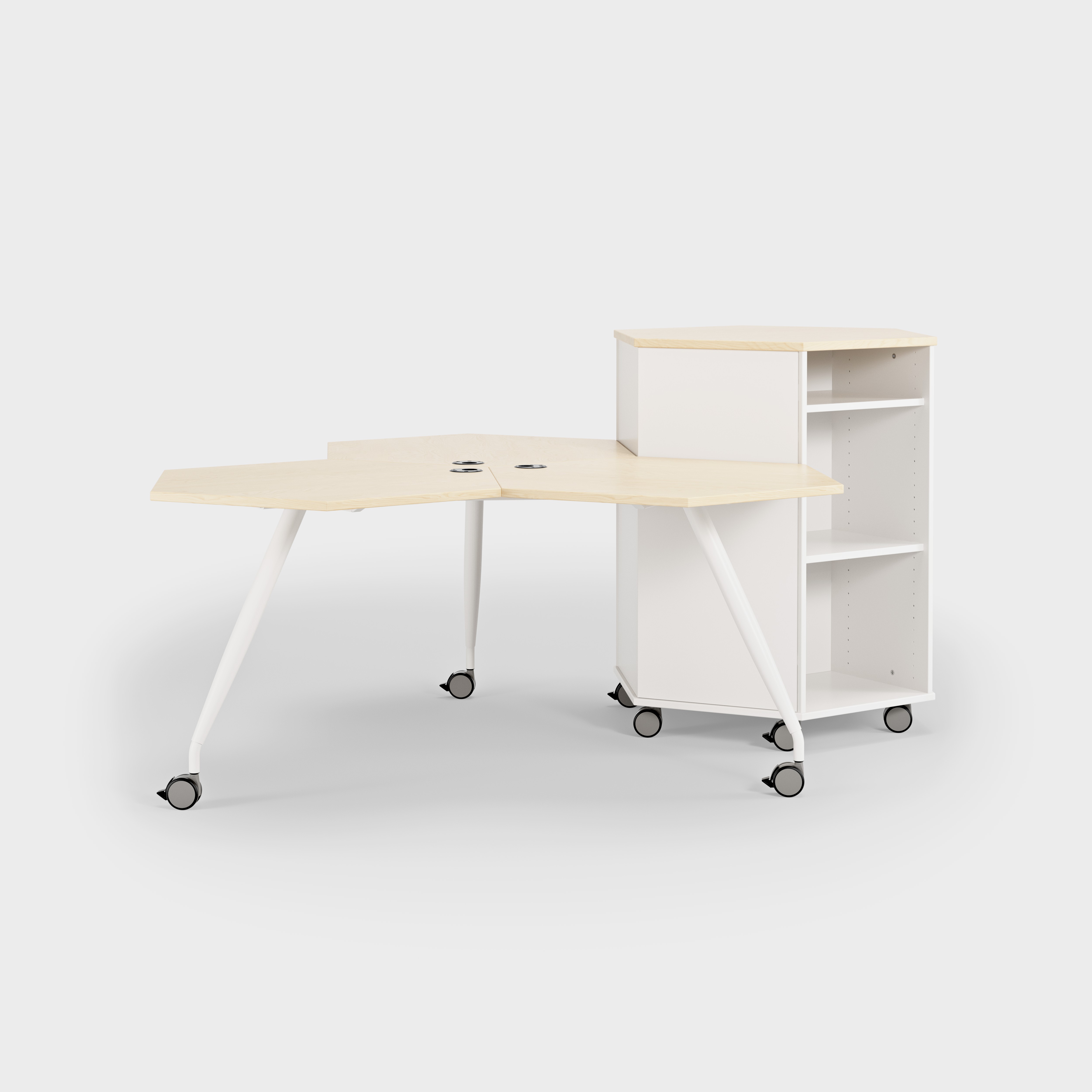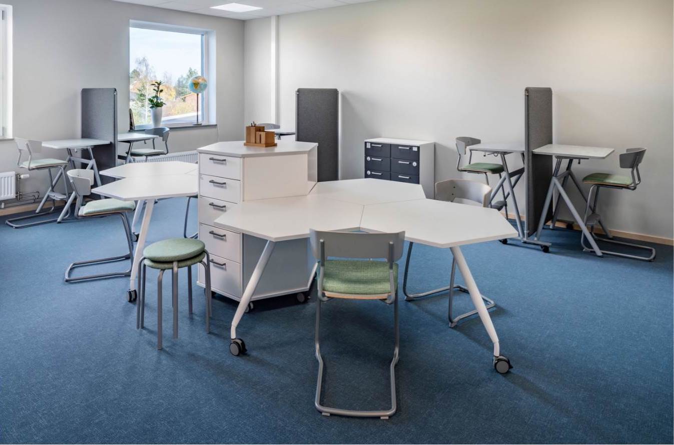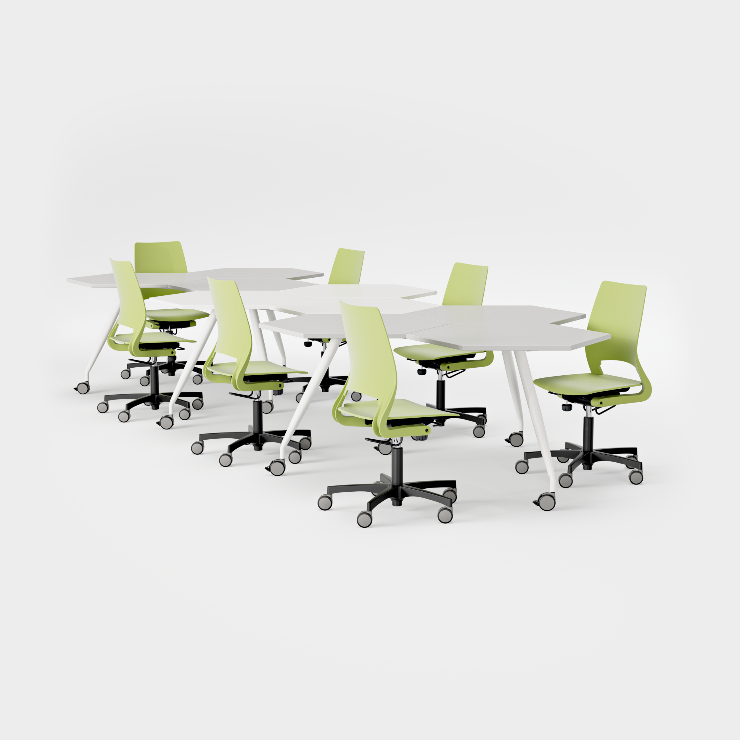 Trixagon, değişen ihtiyaçlarınızı karşılamak için hızla yeniden düzenlenebilen bir bilmecedir. Merkezde, bireysel veya grup çalışması, eğitim, okul ve konferans masası olarak kullanılabilen altıgen masalar bulunur. Tablolar, grup tablolarından uzun tablolara kadar çeşitli takımyıldızlarla bağlantılı olabilir. Kolayca yuvarlanabilen ve kilitlenebilir tekerleklerle donatılmıştır, bu da yenilenmeyi kolaylaştırır. Ekipman ve şarj için elektrik prizleri ile donatılabilirler ve proje çalışmaları, grup sunumları ve video konferans için mükemmeldirler.