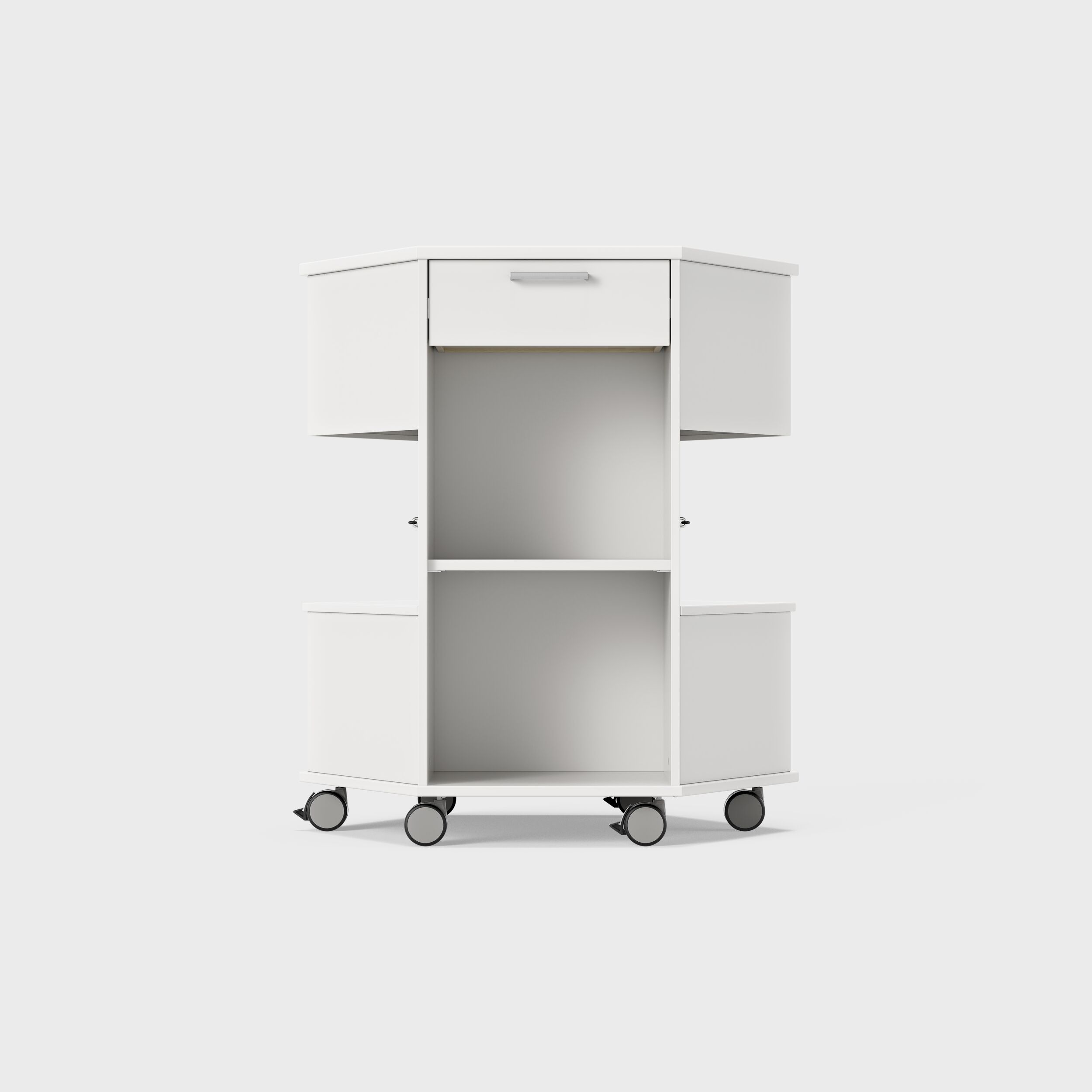 Tekerlekli dolap ve serideki diğer ürünler, ofiste veya okulda kolayca yeni çözümlere dönüştürülebilir. Bireysel çalışma alanlarından ve grup çalışma alanlarından atölyeler ve konferans masaları için yüzeylere kadar. Depolama ünitesi ayrıca büyük çözümler oluşturmak için gruplar halinde yerleştirilebilir veya bir resepsiyon bankosu veya kürsü yapmak için ayrı ayrı kullanılabilir. Dahili esnekliği ve yenilikçi tasarımıyla Trixagon ailesi, ofislerde, okullarda, kütüphanelerde, bekleme salonlarında, lobilerde ve konferans salonlarında işlevsel ve ilham vericidir.