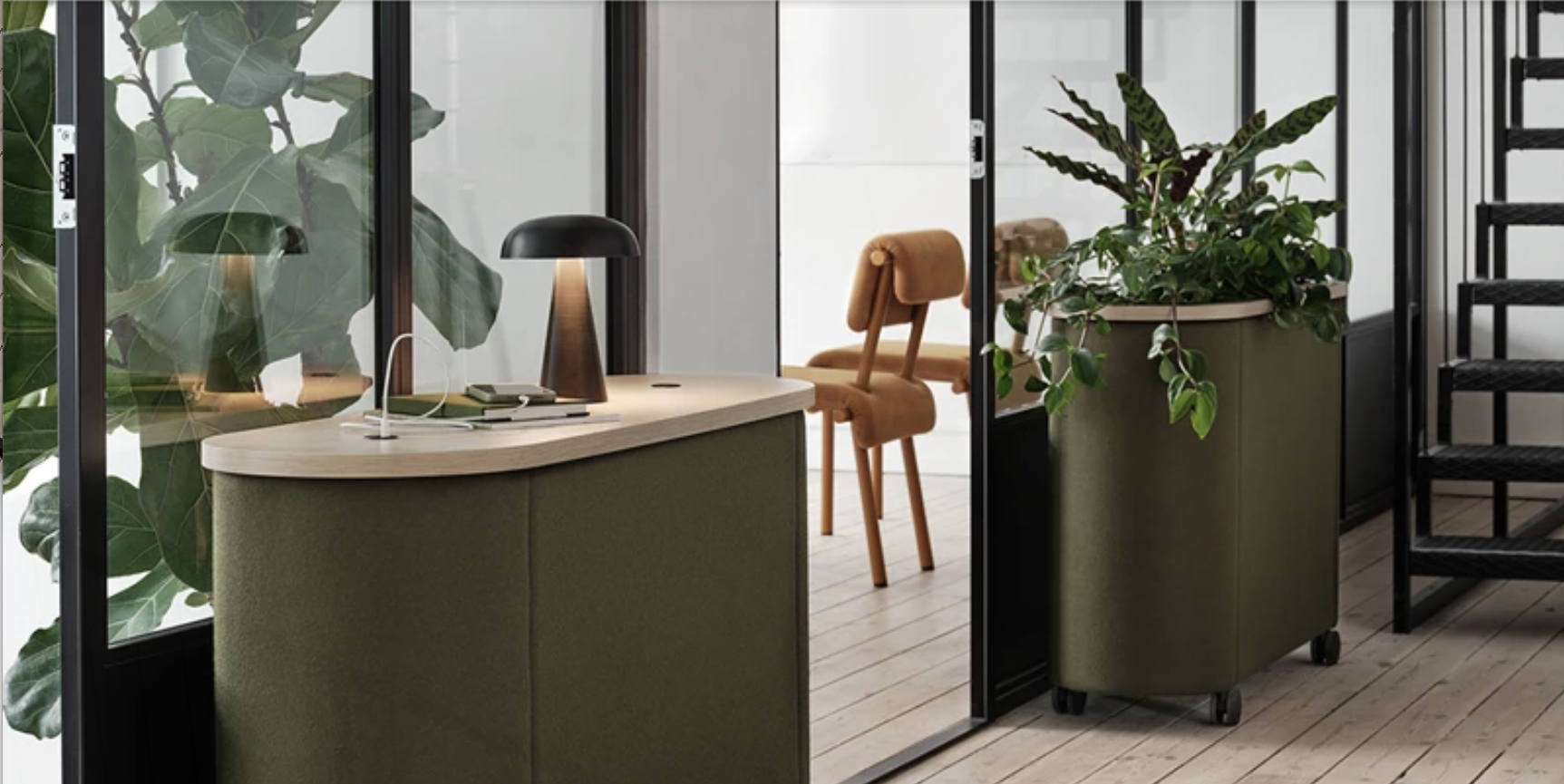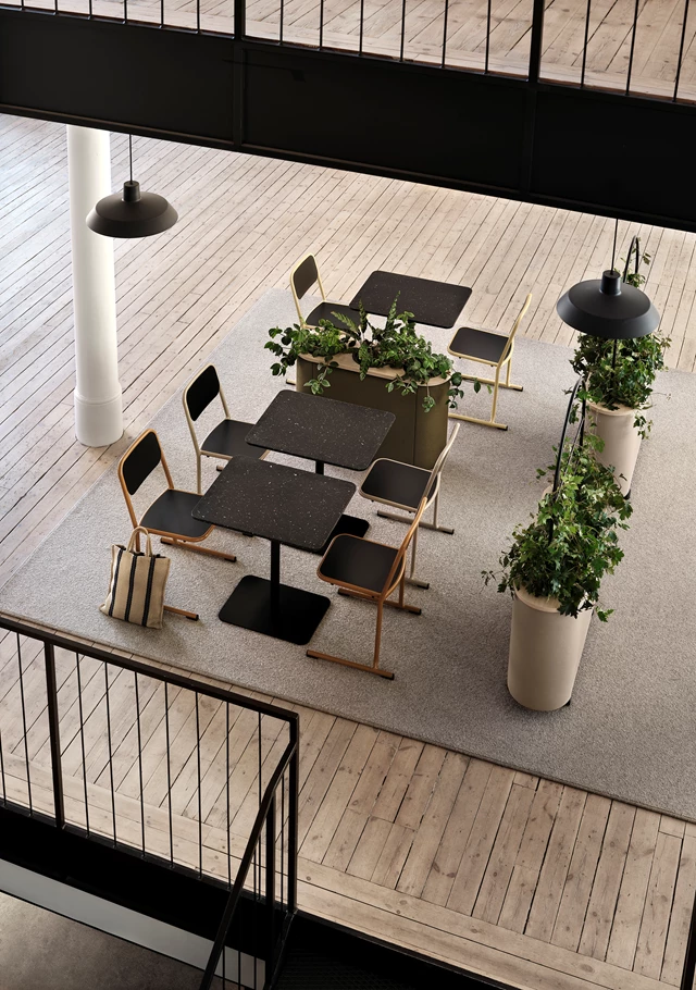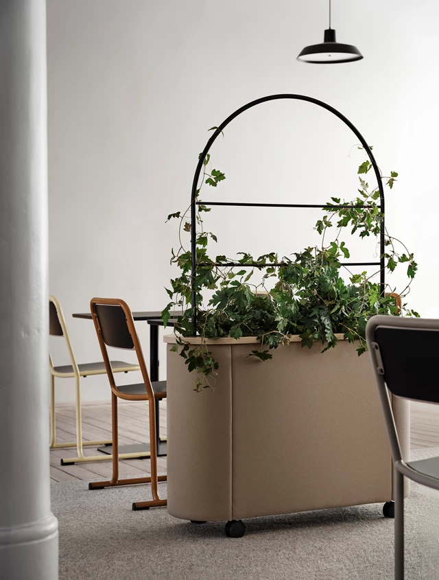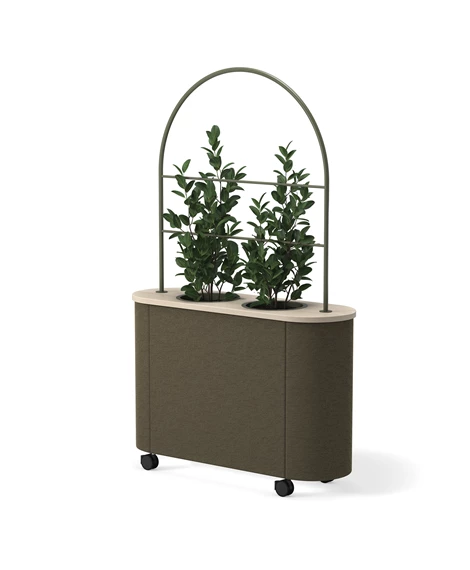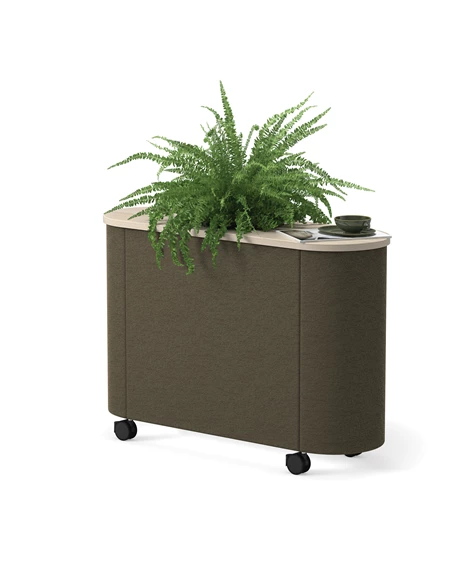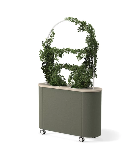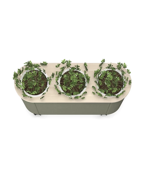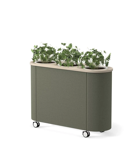 Dişbudak laminat F8843'ten masa tablası. Siyah (RAL9005) veya beyaz (RAL9016) lake alüminyumdan üç saksı. %100 geri dönüştürülmüş plastikten yapılmış, siyah, kendiliğinden sulanan parçalara sahip üç gri saksı. Değerli filtre kumaşından 30 mm döşemeli ses emici. Kilitlenebilir tekerlekler. Opsiyonel olarak Skandiform Renk Koleksiyonu (RAL) cilaları.
