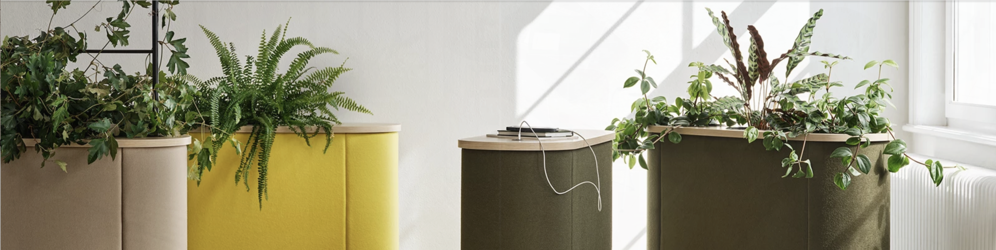 Hedge ayrıca istenmeyen sesleri emip yayarak, doğayı taklit ederek iç mekanınızı daha sessiz ve huzurlu hale getirir. Tekerlekler sayesinde hareketlidir ve temizlik için kolaylıkla hareket ettirilebilir. Hedge, tek tek dikim için 3 saksıya kadar veya bir geniş çerçeveli saksılı ve USB bağlantı noktalarıyla farklı modellere sahiptir.
