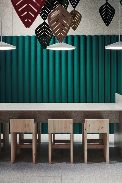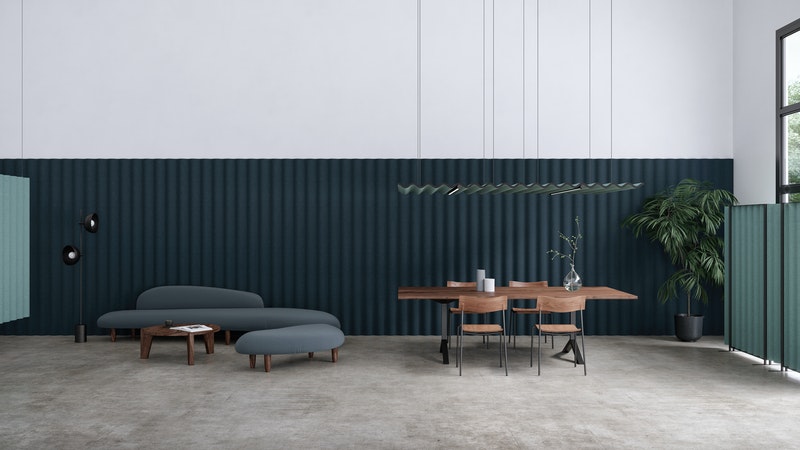 “İlham, İzlanda'da sadece çatıların değil, cephelerin de oluklu levhalarla kaplandığı birçok evden geliyor. Bu Scala ile onu mekana getirme fikrini doğurdu ”, diye açıklıyor ödüllü tasarımcı Anya Sebton. Ses emici Scala'nın tasarımı yalnızca görsel nedenlerle değil, aynı zamanda daha yumuşak bir ses ortamına katkıda bulunmak için geliştirildi.
