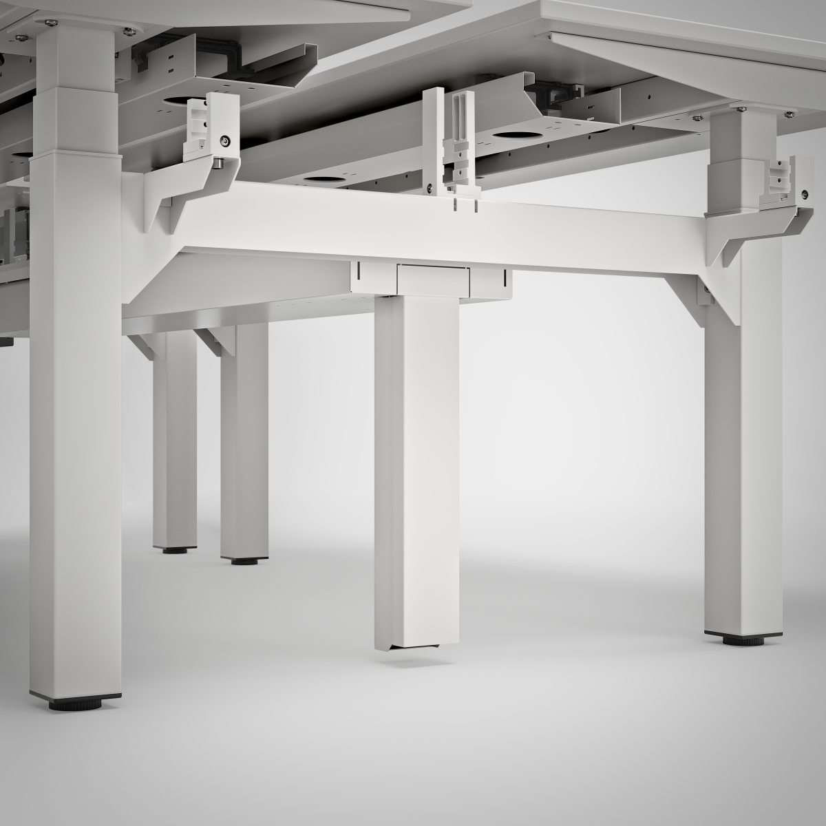 Farklı boyutlarda lamine veya çeşitli yüzeylerde kaplamalı masa tablaları mevcuttur. Kare profil sit-stand ayağı ve alt şasi gümüş grisi, beyaz ve siyah renklerde mevcuttur. Düz olmayan zeminlerle başa çıkmak için bacaklardaki dahili, gizli ayar vidaları kolayca ayarlanabilir.