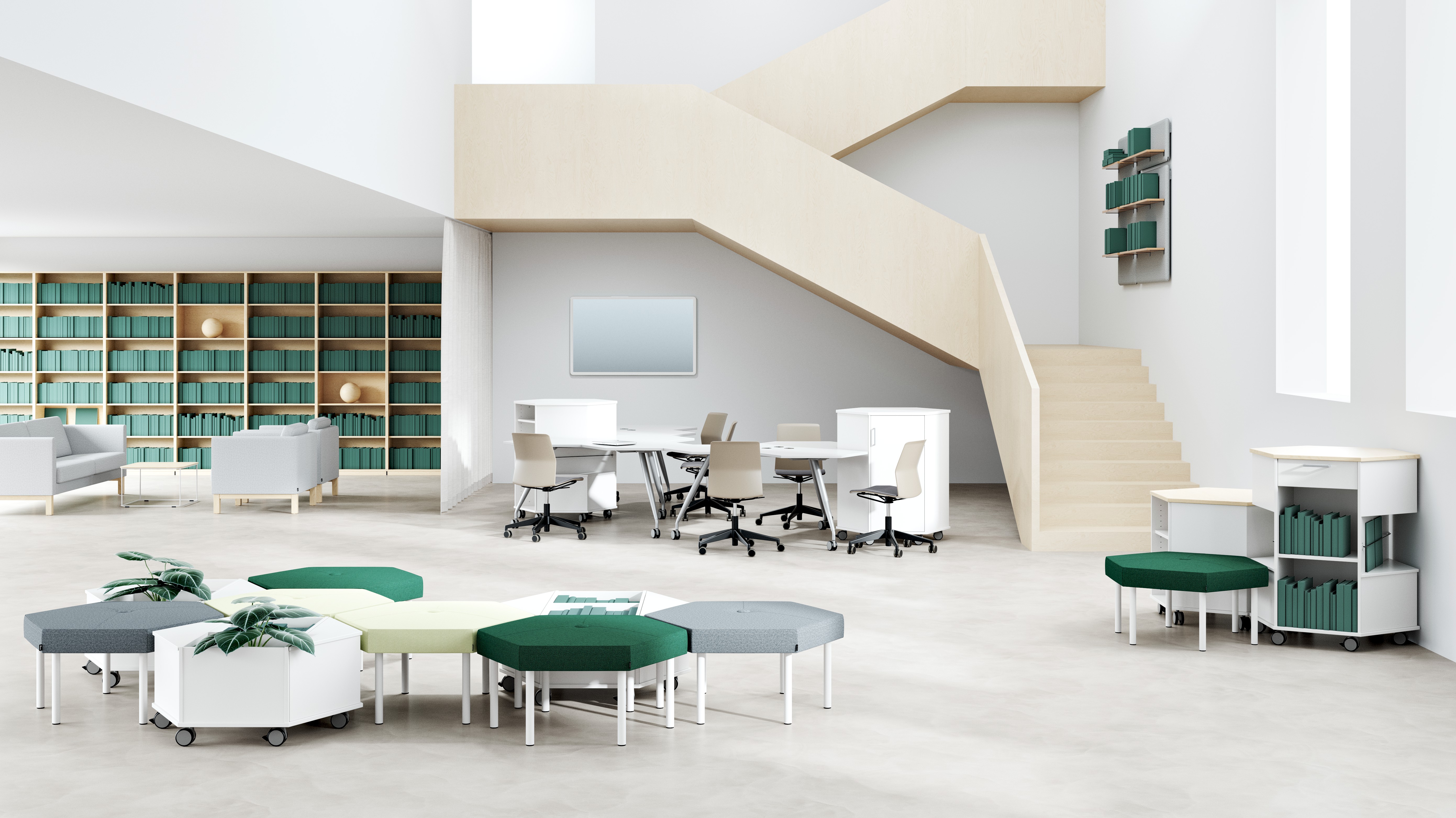 Tekerlekli dolap ve serideki diğer ürünler, ofiste veya okulda kolayca yeni çözümlere dönüştürülebilir. Bireysel çalışma alanlarından ve grup çalışma alanlarından atölyeler ve konferans masaları için yüzeylere kadar. Depolama ünitesi ayrıca büyük çözümler oluşturmak için gruplar halinde yerleştirilebilir veya bir resepsiyon bankosu veya kürsü yapmak için ayrı ayrı kullanılabilir. Dahili esnekliği ve yenilikçi tasarımıyla Trixagon ailesi, ofislerde, okullarda, kütüphanelerde, bekleme salonlarında, lobilerde ve konferans salonlarında işlevsel ve ilham vericidir.