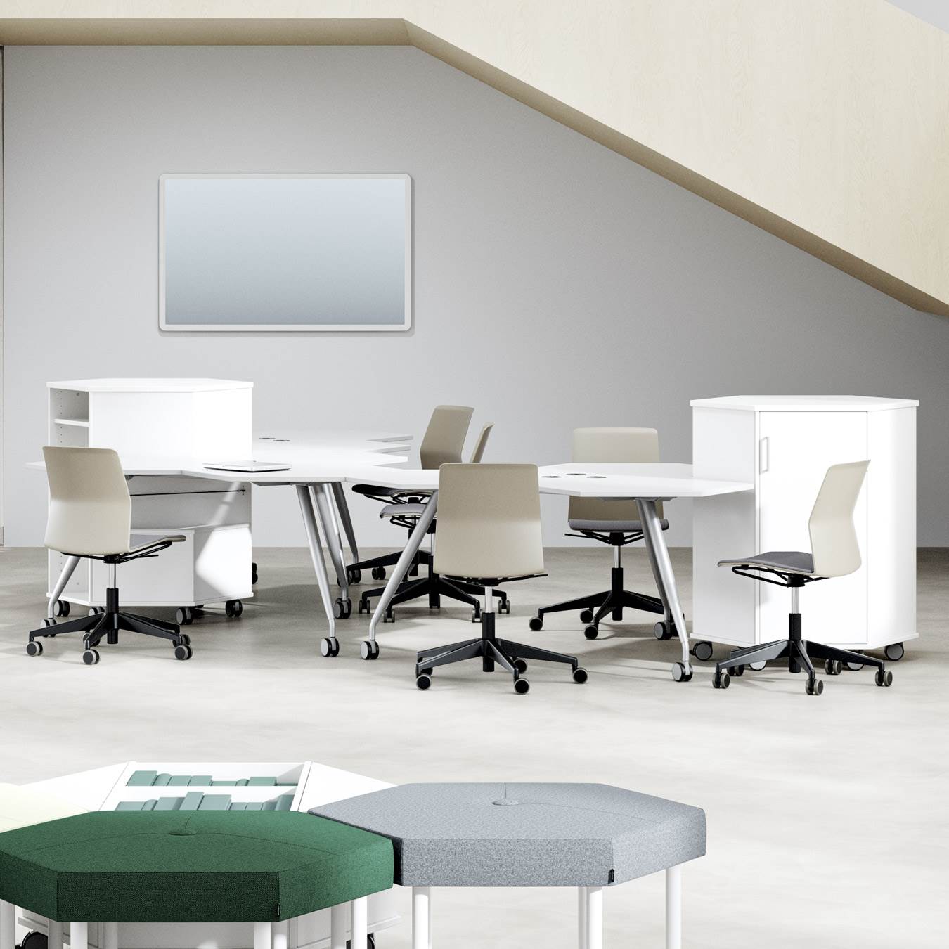 Trixagon depolama ünitesi, bir yapboz gibi birbirine uyan akıllı altıgen biçimli mobilya ürün ailemizin bir parçasıdır. Depolama ünitesi, kolayca yeniden düzenlenebilmesi için tekerleklerle donatılmıştır ve bu da onu tüm aktif ofis ve okul ortamlarında mükemmel bir çözüm haline getirir.